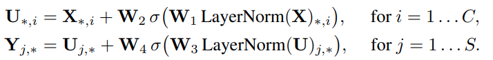 윗 줄의 수식이 token mixing layer, 그 밑이 channel mixing layer이다.