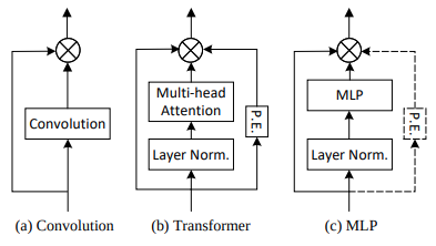 위 구조에서 보듯 mixing block을 convolution layer, Transformer layer, MLP layer로 대체가 가능한 plug-and-play module로 구성된다. (mixing block을 제외한 다른 component는 고정!)