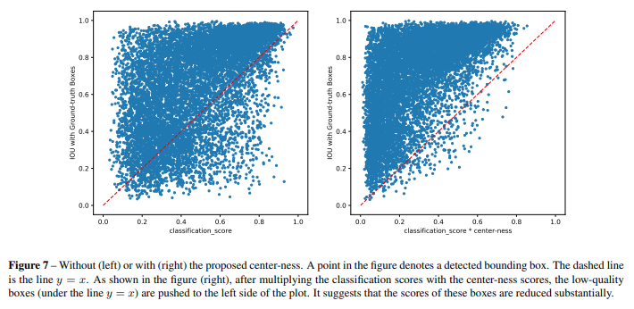 위의 그림 왼쪽을 보면 낮은 품질의 bbox(low-quality predicted bbox)가 많이 존재하게 된다. 하지만 center-ness score와 classification score를 곱한 값을 이용하면 낮은 품질의 bbox를 많이 줄일 수 있어서 성능 개선을 얻을 수 있다는 것을 알 수 있다.