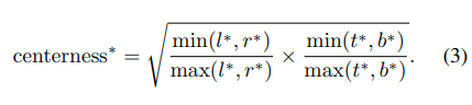 center-ness는 location에서 해당 location이 속한 object의 중심까지의 거리를 정규화된 값으로 나타낸다. location을 위한 regression target $l^, t^, r^, b^$ 가 주어지면 center-ness target은 아래와 같이 주어진다.
