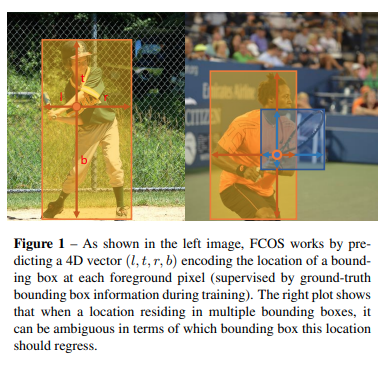 FCN-based framework는 feature map에서 각각의 spatial 위치의 4D vector (l, t, r, b), class 총 다섯 개를 예측해 낸다. 4D vector는 bbox의 네 면과 object의 위치까지의 offset을 의미한다. (figure 1 왼쪽 그림 참조)
