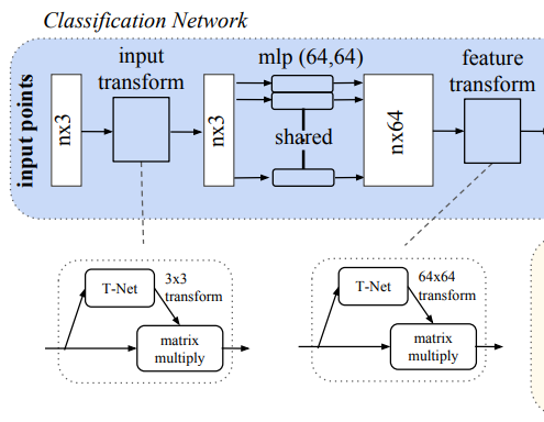 따라서 T-Net을 통하여 input matrix를 canonical space로 변환 할 수 있는 affine matrix (3x3, 64x64)를 prediction 하여 그 matrix를 input에 multiply 하여 진행합니다.
