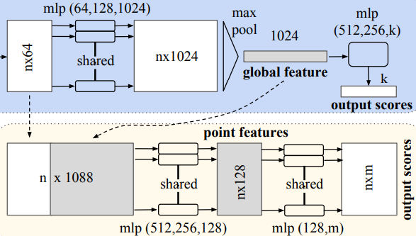 PointNet의 architecture입니다. network를 보시면 classification network, segmentation network로 크게 두 개의 network로 구성되어있습니다.